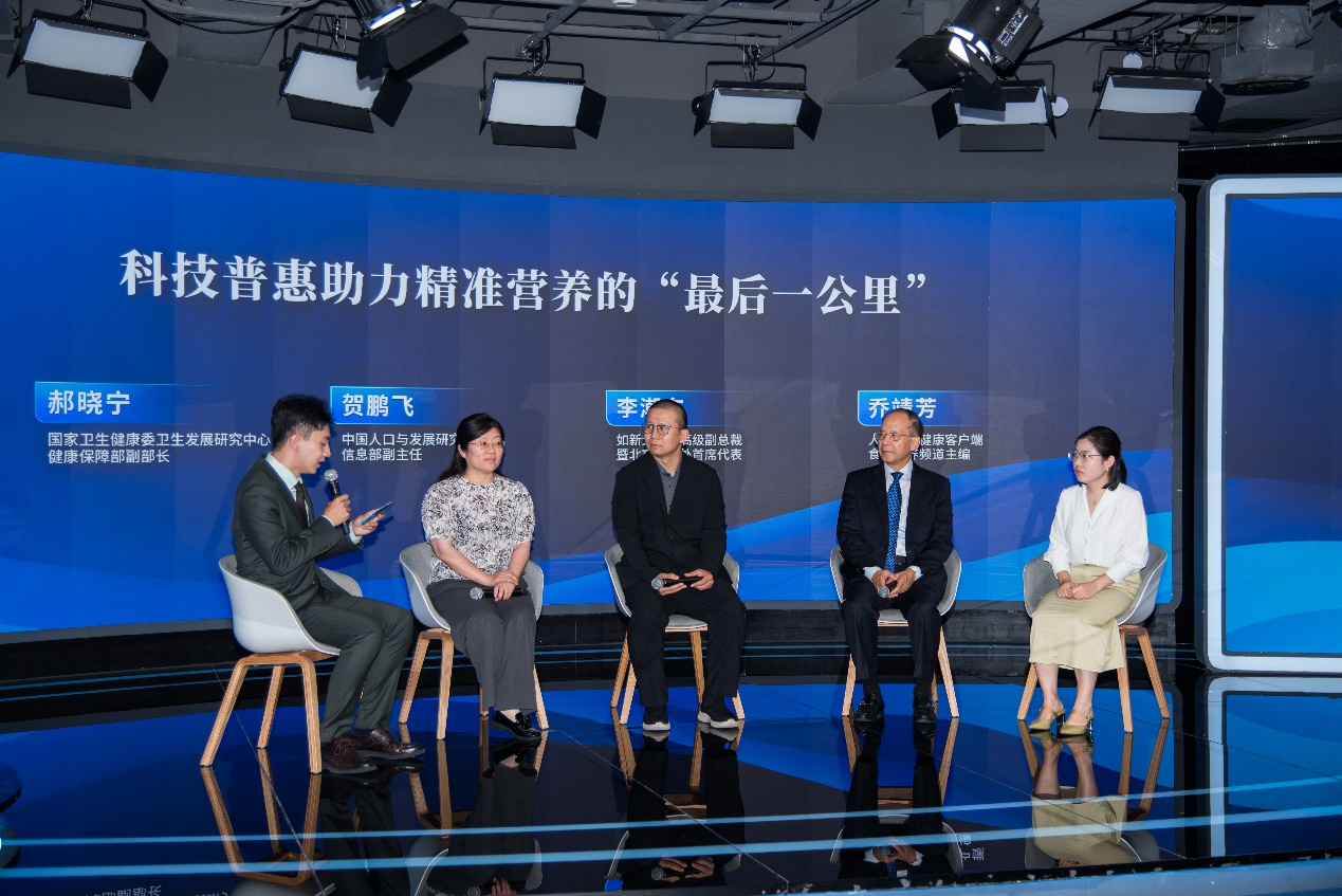会议下半场以“科技普惠助力精准营养的‘最后一公里’”为主题,国家卫生健康委卫生发展研究中心健康保障部副部长郝晓宁、中国人口与发展研究中心信息部副主任贺鹏飞、如新大中华高级副总裁暨北京代表处首席代表李潮东、人民日报健康客户端食品营养频道主编乔靖芳围绕政策支持、技术落地、生态构建等议题展开深入探讨。